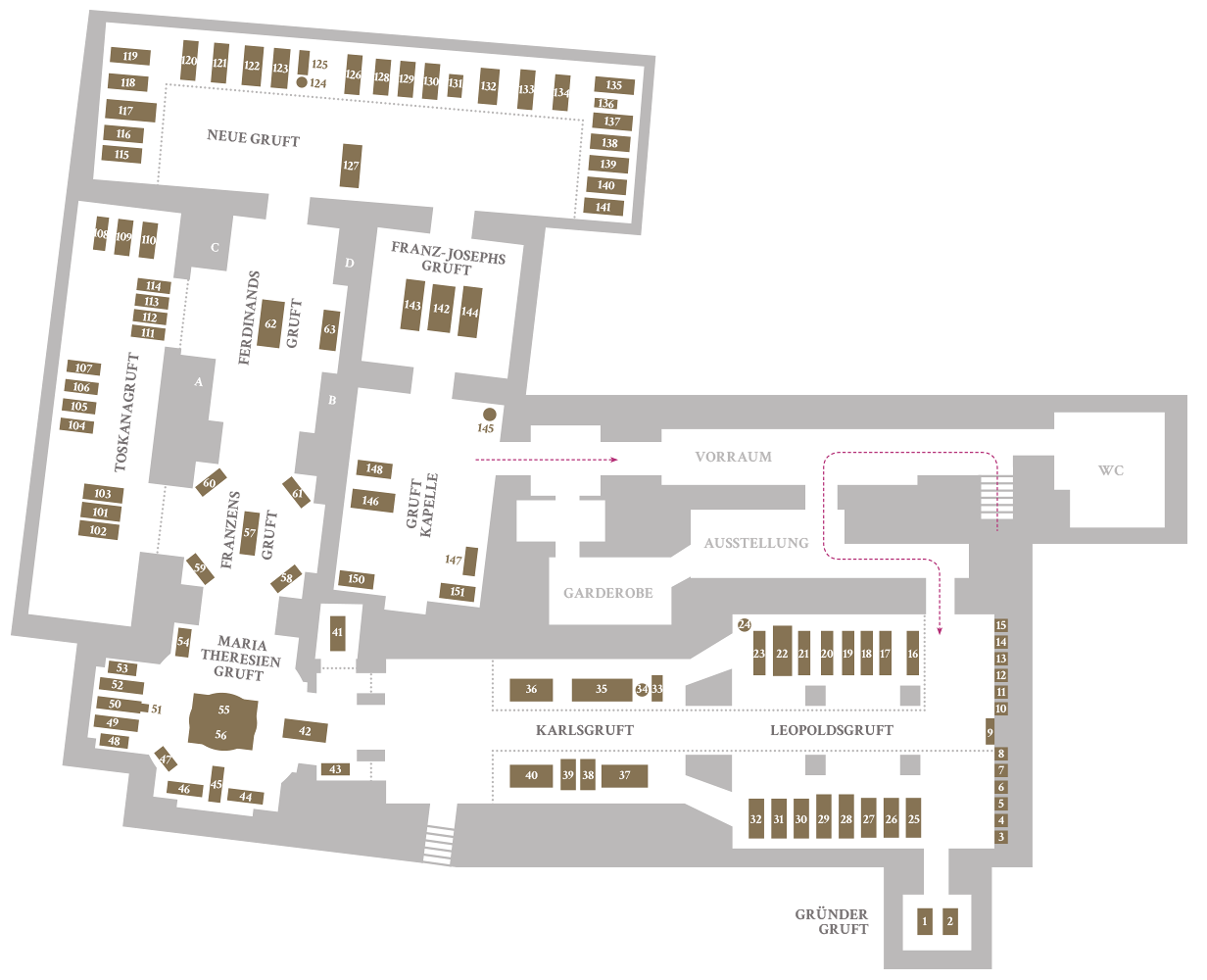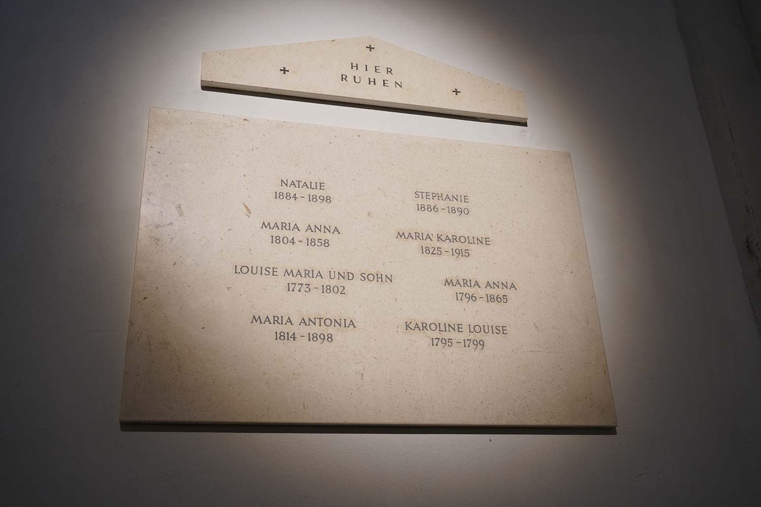 The niches are now bricked up, with only four marble plaques revealing the names of the 37 Habsburgs who were buried here in a large-scale reburial operation in 1960 to alleviate the lack of space in the Tuscan Vault. In the crypt itself, Emperor Ferdinand I. (N°62) and his wife Maria Anna (N°63) are buried in magnificent sarcophagi.